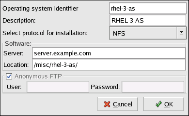 Select protocol for installation — Select NFS, FTP, or HTTP as the network installation type depending on which one was configured previously. If FTP is selected and anonymous FTP is not being used, uncheck Anonymous FTP and provide a valid username and password combination.