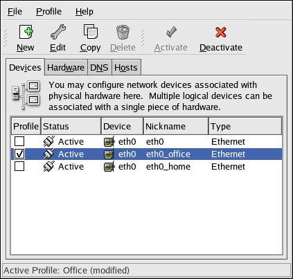 For example, Figure 8-16 shows a profile called Office with the logical device eth0_office. It is configured to activate the first Ethernet card using DHCP.