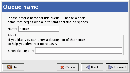 In the window shown in Figure 34-3, enter a unique name for the printer in the Name text field. The printer name cannot contain spaces and must begin with a letter. The printer name may contain letters, numbers, dashes (-), and underscores (_). Optionally, enter a short description for the printer, which can contain spaces.