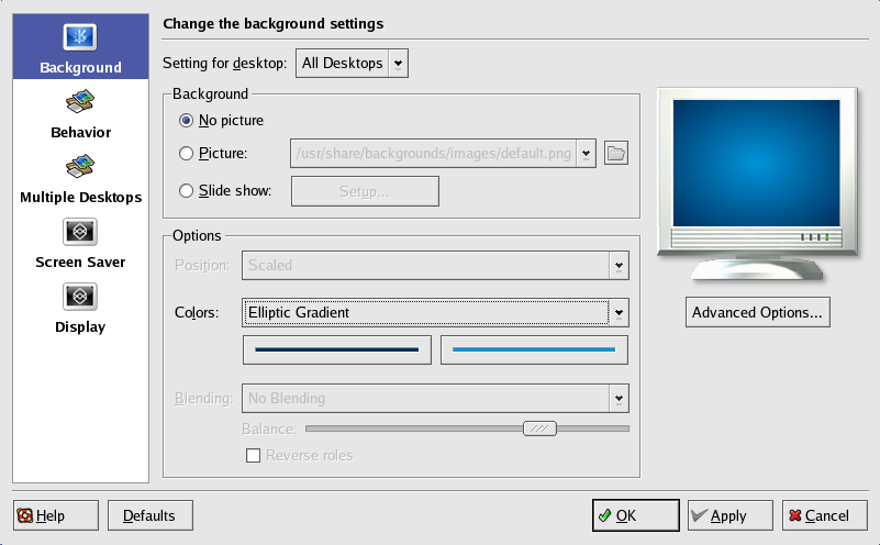 The Configure-Desktop window contains the Background, Behavior, Multiple Desktops, Screen Saver, and Display configuration icons. Click each icon in turn and select the configuration options you prefer.